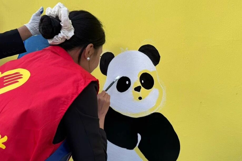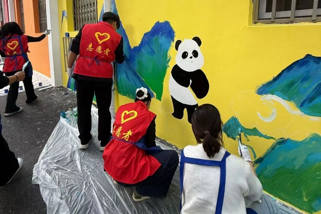 红色梯子上,同学仔细勾勒山峰的锐利线条;地面上,另一位同学快速调和出渐变的湖水蓝,手脚麻利地给同伴递上干净画笔。蓝色的公益围裙上沾了点点彩墨,大家却毫不在意,时不时抬头看看整体效果,又低头专注补色。