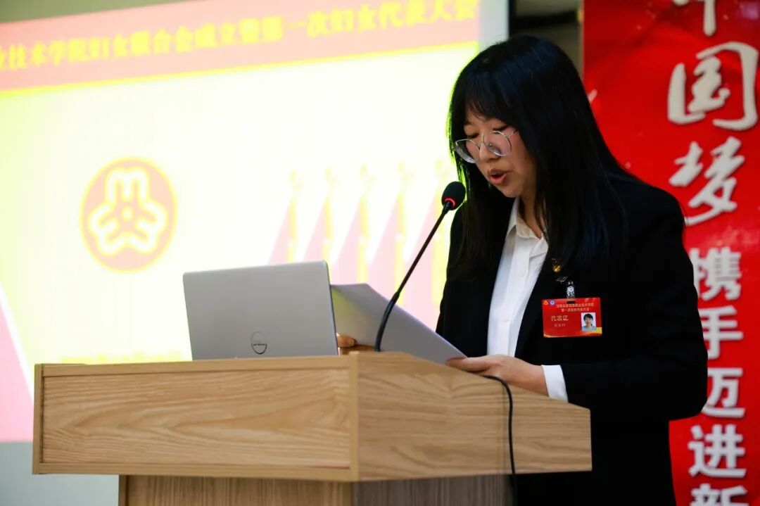 新当选的妇联主席张利芳作表态发言。她表示,将带领第一届执委会牢记使命、恪尽职守,紧紧围绕学校中心工作,立足妇女需求,发挥妇联组织桥梁纽带作用,团结引领全校广大女教职工、女学生在教学科研、人才培养、校园建设等各领域勇挑重担、建功立业,不辜负学院党委和全体妇女同胞的期望。