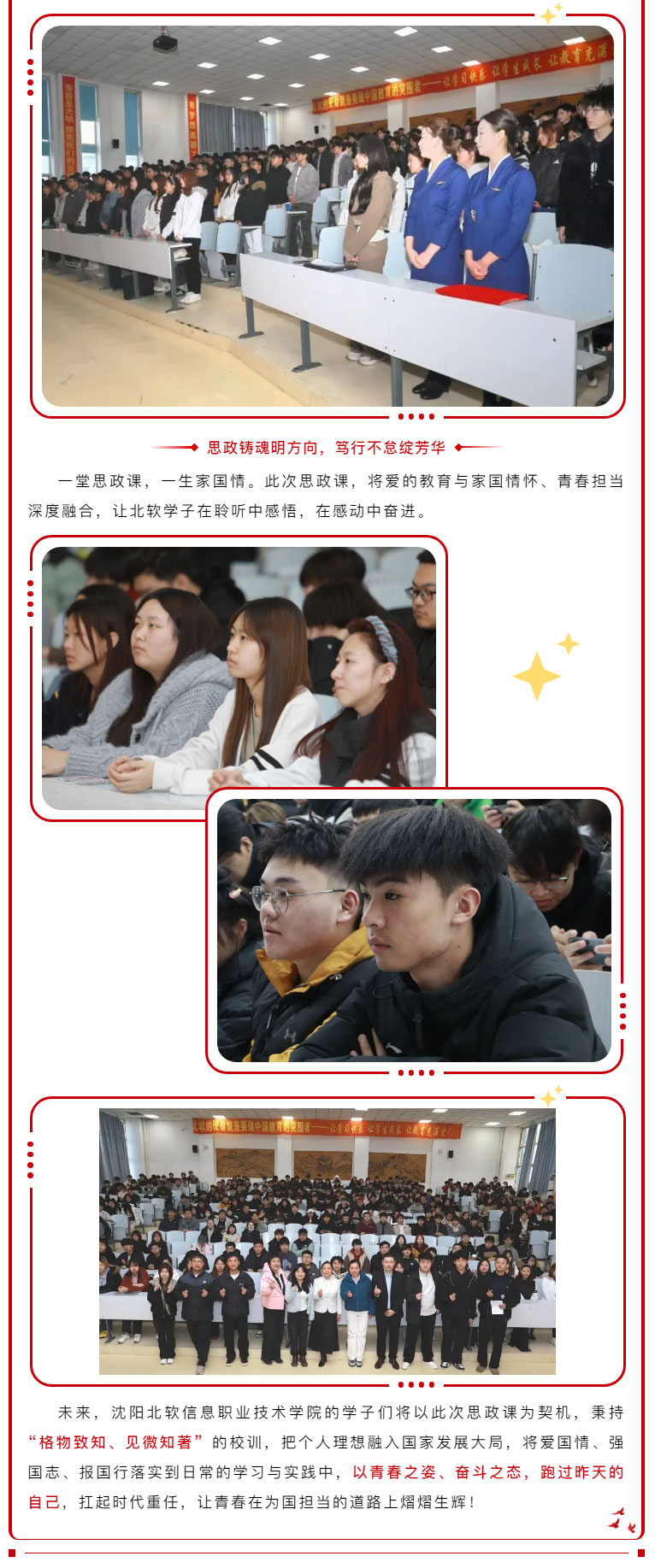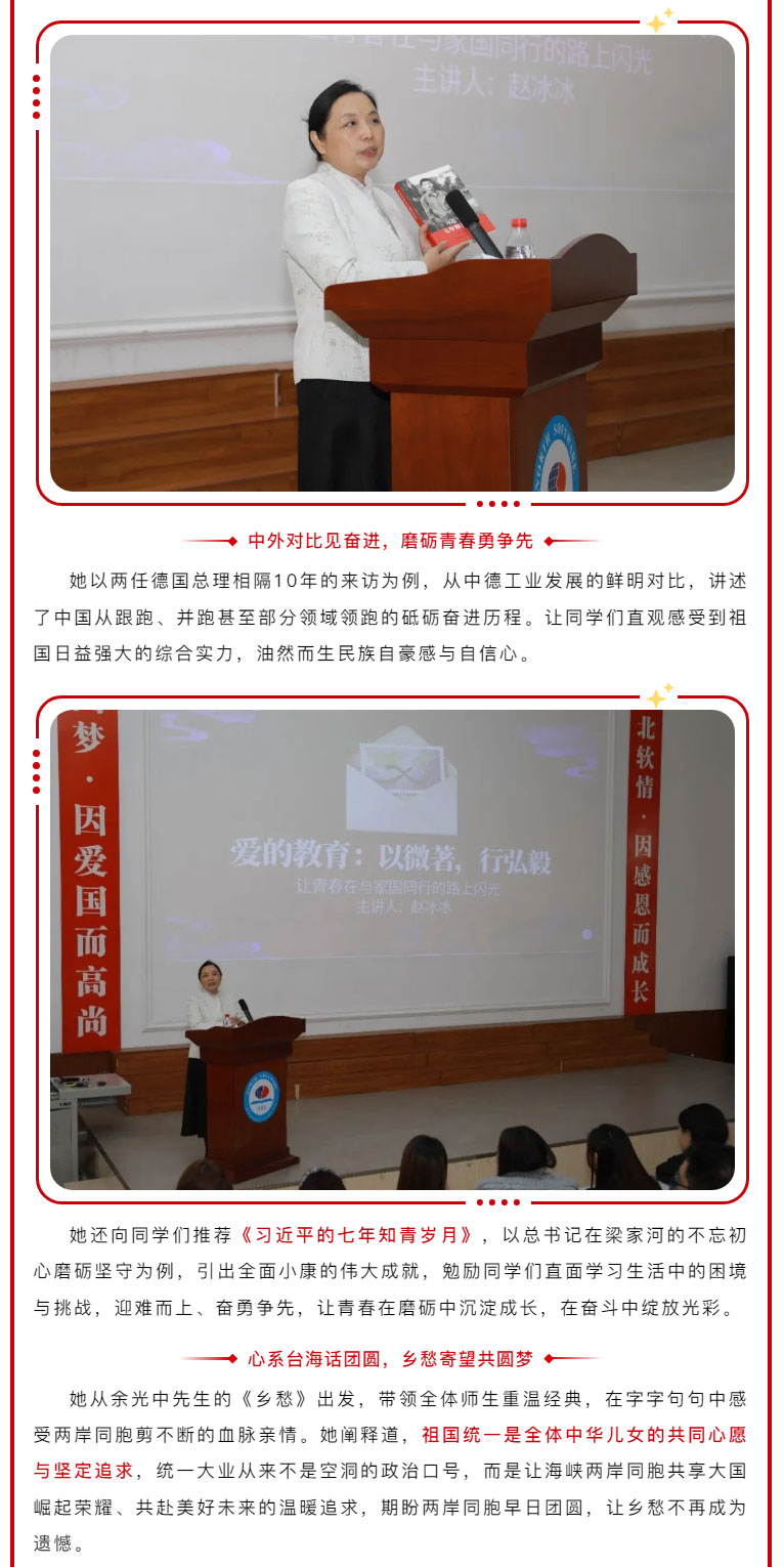 为厚植北软学子家国情怀,引导青年学子勇担时代使命,我校特邀辽宁省台联党组书记赵冰冰同志来校调研并以”爱的教育:家国情怀与青春担当” 为主题,结合自身成长经历、外侨港澳台工作和对《习近平的七年知青岁月》的解读,与师生进行交流互动,堪称一场别开生面的思政课。