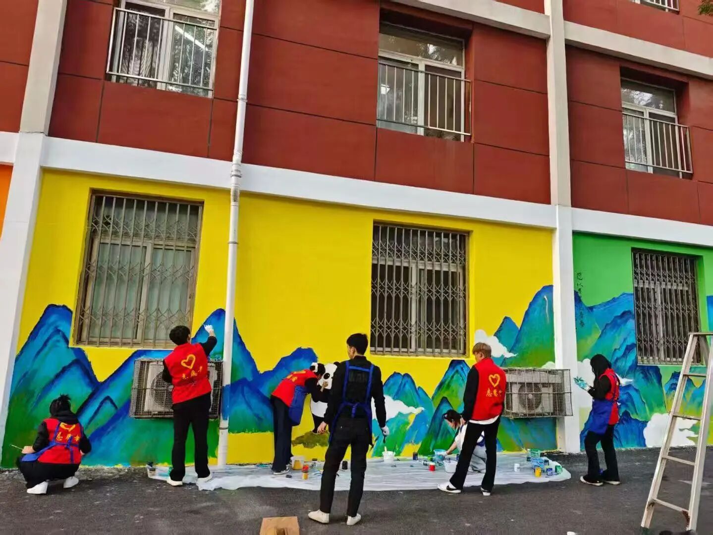 红色梯子上,同学仔细勾勒山峰的锐利线条;地面上,另一位同学快速调和出渐变的湖水蓝,手脚麻利地给同伴递上干净画笔。蓝色的公益围裙上沾了点点彩墨,大家却毫不在意,时不时抬头看看整体效果,又低头专注补色。