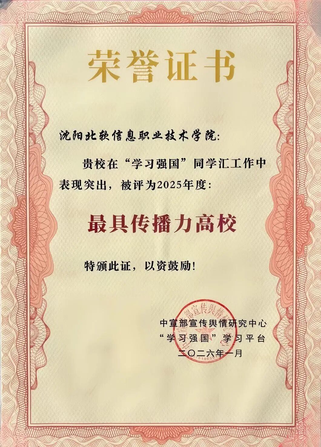 近日,“学习强国”学习平台公布了“学习强国”同学汇2025年度评选结果。沈阳北软信息职业技术学院被中宣部宣传舆情研究中心、“学习强国” 学习平台授予2025年度“最具传播力高校”荣誉称号。