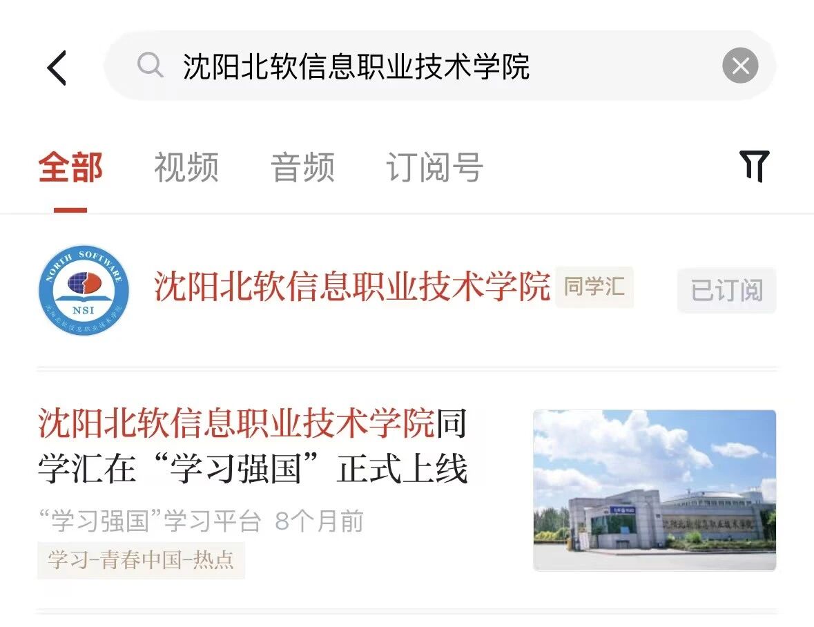 欢迎广大用户在学习强国APP首页搜索“沈阳北软信息职业技术学院”,点击订阅,即可及时收到我校的最新资讯。