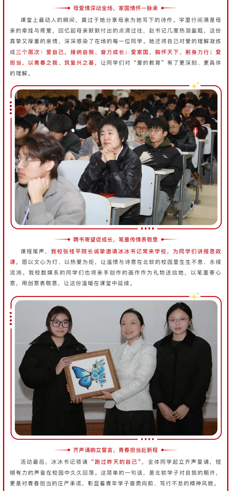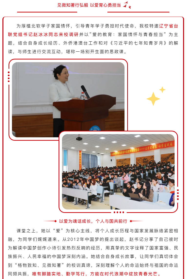 为厚植北软学子家国情怀,引导青年学子勇担时代使命,我校特邀辽宁省台联党组书记赵冰冰同志来校调研并以”爱的教育:家国情怀与青春担当” 为主题,结合自身成长经历、外侨港澳台工作和对《习近平的七年知青岁月》的解读,与师生进行交流互动,堪称一场别开生面的思政课。